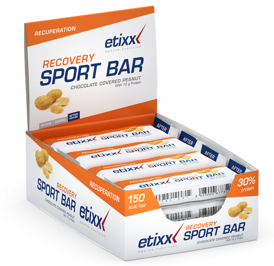 Etixx Recovery Sport Bar przyczynia się to do utrzymania masy mięśniowej. Zawiera białko serwatki, które jest naturalnym i skutecznym suplementem budującym masę mięśniową. Zawiera komplet niezbędnych aminokwasów egzogennych, w tym leucynę, izoleucynę i walinę, które odgrywają zasadniczą rolę w procesach anabolicznych oraz regeneracyjnych po treningu. Wykazano, że węglowodany w połączeniu z białkiem odnawiają wydajność oraz pomagają w regeneracji lepiej niż same węglowodany. Etixx Recovery Sport Bar zawiera ok. 17 g węglowodanów i ok. 13 g białka.